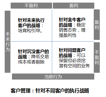 至于当前盈利、未来不盈利的客户,收缩产品线和合作范围,不失为一个好招。收益少了,可投入也随之下降,总体的客户收益还过得去。现在和未来都不盈利的客户,也只能帮你消化一下固定成本,别做太多指望。若您的客户数量不成问题,那此类客户最好还是削减为妙。