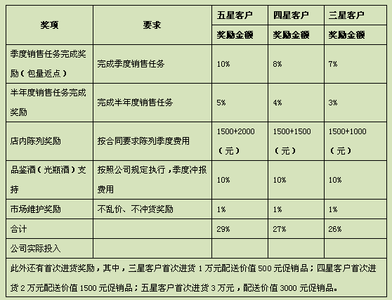 (4)品鉴酒支持:合作期内,企业为支持店方对其目标团购客户开展公关工作,企业提供季度任务的一定数量的品鉴酒,每季度发放一次,用于店方的品鉴用酒和公关赠酒支持。