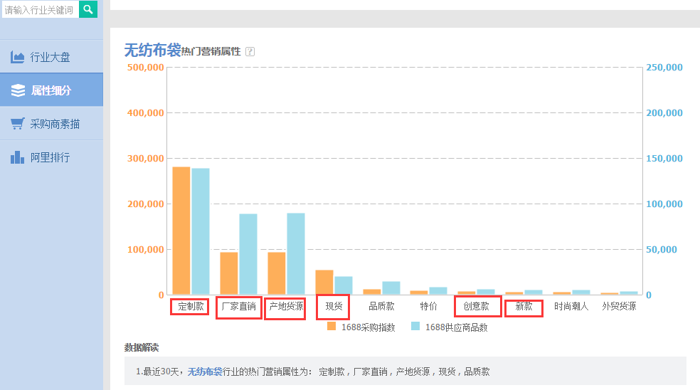 转化率榜同样要每天倒出来,且选择关键词时应该这样选择:选搜索转化率高的全站商品数少的关键词,同理看30天找出常出现的关键词用到标题中。顺便提一下修饰词,同样我们说要热度高的修饰词,我们可以从阿里指数的属性细分里面找到一些热度高的修饰词,如图4-6所示。