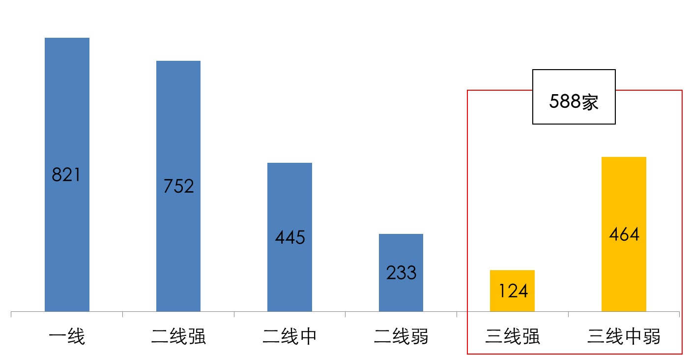 中国购物中心在各个城市经历了层级化的发展过程,兴起和发展初期主要集中于北上广深等一线城市。截止到2012年底,北上广深这四个一线强城市的购物中心数量高达821家,占全国总量的四分之一。如图4-10所示。