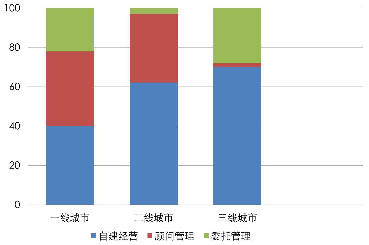 图4-11 国内购物中心经营管理方式与一二三线城市比例