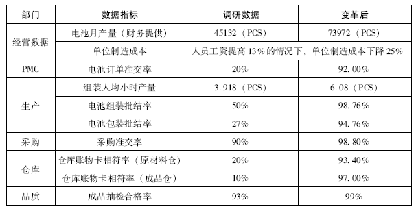 :对。电池的订单准交率由调研时的20%提升到变革后的92%,组装人均小时产量由调研时的3.918PCS/小时,提升到6.08PCS/小时,电池组装批结率由50%提升到98.76%,电池包装批结率由调研时的27%,提升到94.76%,采购准交率由90%提升到98.80%,原材料仓的仓库账物卡的相符率由20%提升到93.40%,成品仓的账物卡相符率由10%提升到97%,成品抽检合格率由93%提升到99%。