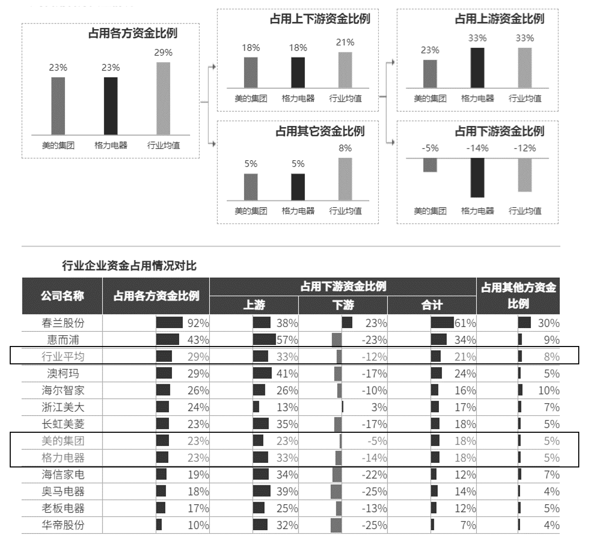 而占用各方资金比例主要由三部分组成,包括上游供应商、下游客户和其他方,其中其他方包括但不限于税务和员工薪酬,其比例一般差异不大。
