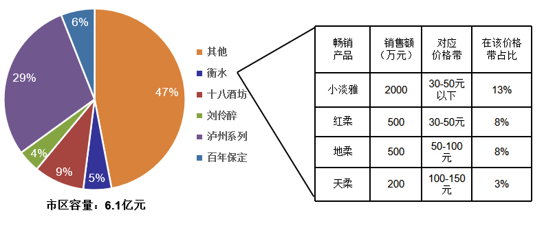泸州老窖在保定的产品线分布从7~1000多元,在400元以上、200~400元、150~200元、100~150元、50~100元、20~50元等多个价格段上均有1~2款畅销产品。
