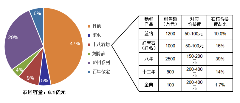 刘伶醉产品系列包括:老字号系列、年份系列、情系保定系列等。畅销产品主要有刘伶醉十二年、刘伶醉老字号等,保定市区销售额约为2500万元,如图5-2所示。
