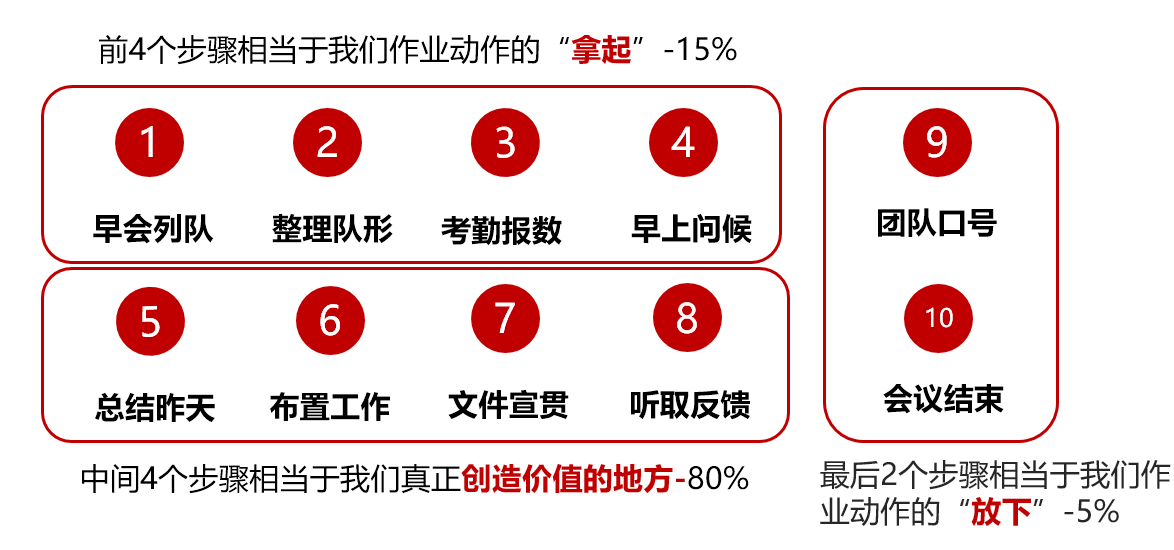 在早会的十个步骤中,前四个布骤(早会列队、整理队形、考勤报数、早上问候),对于早会这个工作任务来讲,是不创造价值的,我们不应该花费很长的时间在前四个步骤里面。同样的,后两个步骤(团队口号、会议结束)也是不创造价值的,也需要将此时间进行压缩。真正创造价值的就是中间的四个步骤(总结昨天、布置工作、文件宣贯、听取反馈),正是这四个步骤承接了班组生产的任务重担,必须要让它有质量的召开,所以所占的时间比重也会很多。很多班组长缺乏了这种精益思维,不知道早会的核心价值重点在哪里!以为召开早会就是执行完成早会的十个步骤而已,把很多的时间花费在了整理队形、报数、喊口号上面,其实是误解了早会召开的目的和核心内容。