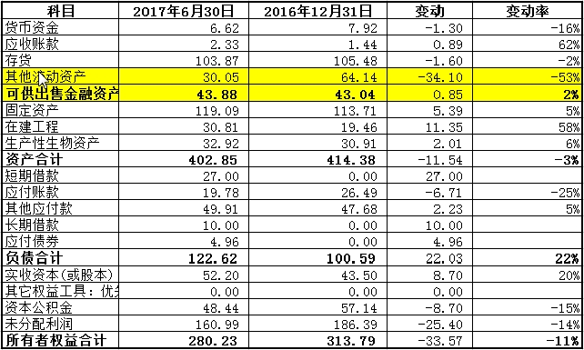 第一组:牧原股份(表1-9)和温氏股份(表1-10)。温氏股份作为最大的养猪企业,货币资金虽然只有6亿元,但是有30亿元的理财产品。这种对上下游议价能力如此强的企业,货币资金依然相对较少,原因是更多的资金都沉淀在固定资产投资和存货里了,这是农林牧渔企业的硬伤。此外,温氏股份的所有者权益大幅减少25.40亿元,可以看到是未分配利润的减少,即2017年度里温氏股份大幅分红了。对比牧原股份的资产负债表,牧原股份的所有者权益大幅增加36.25亿,这说明温氏股份扩张的决心远远不及牧原股份。