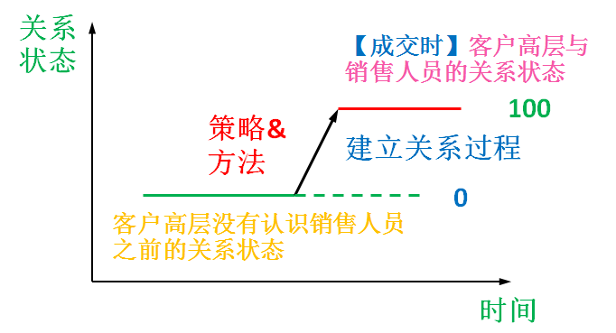 如图7-1所示,销售人员没有与客户高层接触前,他们没有关系,可以说关系值是0。通过开展与客户高层建立关系活动,他们的关系逐步加深,直至达到成交时的关系状态100(假设此时的关系值为100)。在这个过程中,客户高层对销售人员的信任由0达到100,才会成交。