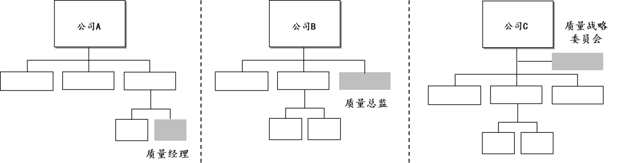 不同的定位将会导致职能部门在“正式组织”的位置不同。以质量管理组织为例,不同的定位在组织结构上的差异如图2-9所示(成立“质量战略委员会 ”意味着公司在组织对质量管理高度重视)。