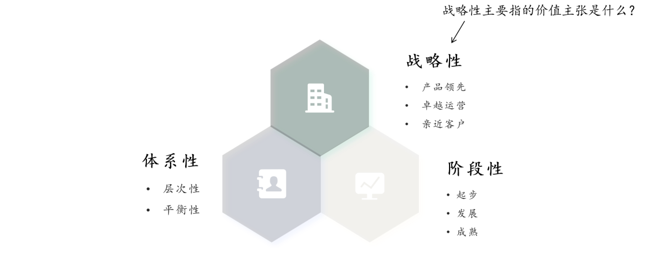 战略目标,是战略意图企业战略之间的连接点。制定目标的主要依据来源于对战略意图的理解。战略目标是企业关于未来需要努力实现目的的一种可以精准测量的描述,是对企业战略经营活动预期取得的主要成果的期望值,即企业在实现战略意图过程中所希望达到的阶段性结果(定量或定性)。理解战略目标需要其体系性、战略性和阶段性,如图2-10所示: