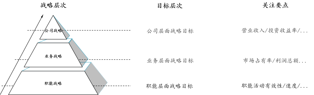首先是体系性,战略目标的体系性是不同层次的目标其关注要点有所不同,例如公司层面目标关注的是营业收入、投资收益率等,业务层面目标关注的是市场占有率、利润总额等,职能层面目标关注的是职能活动有效性、速度等(如图2-11所示)。