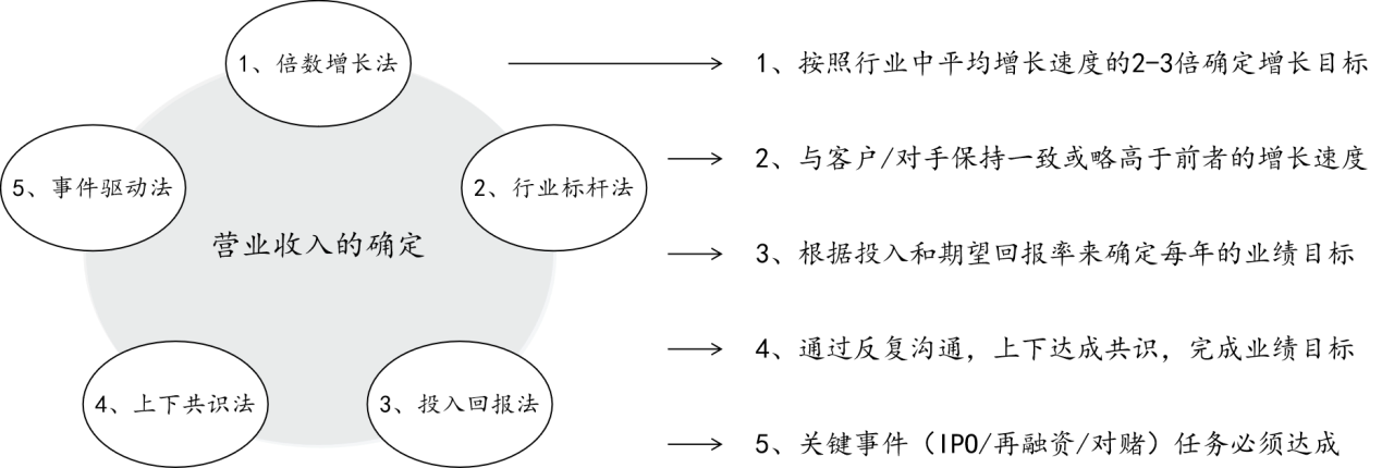 接下来是目标值的确定,在这过程中市场洞察的“中间过程”为目标确定提供依据,即看宏观、看产业、看对手、看客户以及看自己过程中产出的相关数据(例如市场规模、增长速度以及对手、客户的销售预测等)。以下以财务性目标中最重要的额“营业收入”为例说明,营业收入目标的确定,一般有五种方法(如图2-12所示):