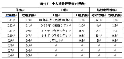职级数 | 职级系数 | 工龄 | 工龄系数 | 考评等级 | 等级系数 |