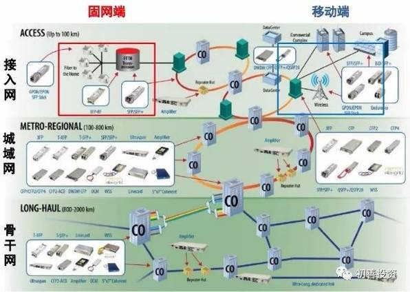 在光模块的传统应用领域——电信市场,光模块主要的应用场景为接入网和传输网。接入网的场景又可以分为有线接入的GPON、XGPON场景和无线接入网中前传、回传、中传场景(5G组网方式中存在中传,4G不存在)。传输网可以分为城域网和骨干网,不同的场景使用的产品会有差异。