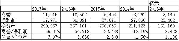 如果考虑把没有商誉的企业剔除,把金融业剔除,那么数据就会触目惊心。这些企业截至2017年上半年度商誉达到10,694亿元,占净资产的比例高达9.14%。而与净利润相比,2016年与2017年几乎持平,即实现的净利润刚好等于商誉余额。一旦发生大规模商誉减值,企业盈利会受到非常大的影响。如表5-2所示。