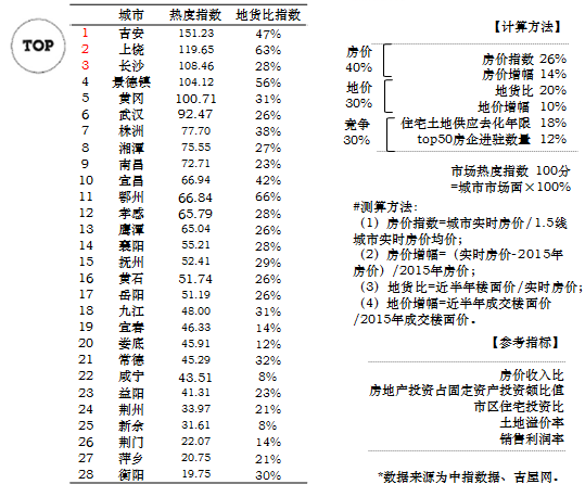 市场热度指数重点考察市场房价、地价现状及涨幅情况,进驻潜力和市场竞争热度,来分析目前的市场热度。长江中游城市群地货比指数中位值为28%,整体来看市场机会适中,可适当进入。热度指数TOP3城市为:吉安、上饶、长沙。
