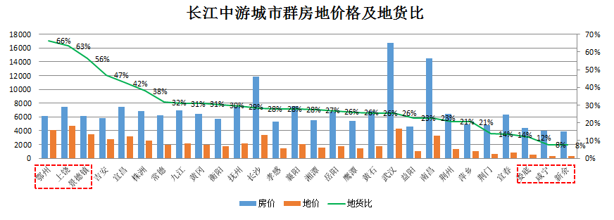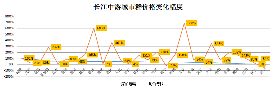 长江中游城市群房价平均涨幅为40%,地价平均涨幅为141%。房价涨幅高于城市群整体平均增幅的城市共有14个,分别为长沙、武汉、南昌、景德镇、宜春、衡阳、襄阳、抚州、鄂州、娄底、黄冈、九江、荆门及株洲;地价涨幅高于城市群整体平均增幅的城市共有11个,分别为吉安、鄂州、黄冈、上饶、景德镇、宜昌、孝感、抚州、湘潭、株洲及鹰潭。