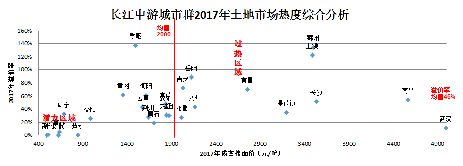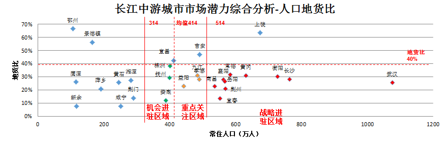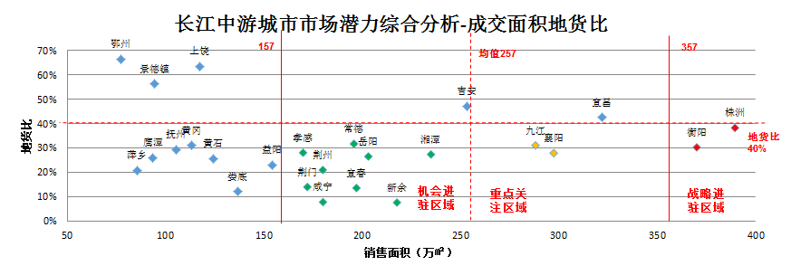 市场潜力从成交面积和地货比两个维度考虑,地货比较低且成交面积较大代表市场潜力较大。战略进驻区域城市共5个,分别为武汉、长沙、南昌、株洲及衡阳;重点关注区域城市共2个,分别为九江、襄阳;机会进驻区域城市共9个,分别为湘潭、岳阳、常德、孝感、荆州、荆门、咸宁、宜春及新余。。