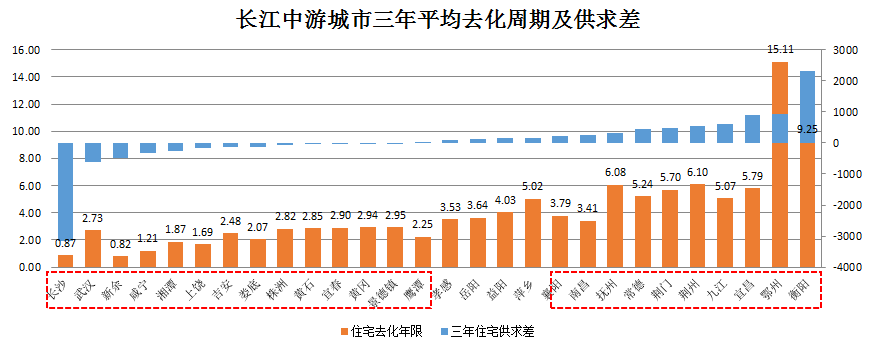 长江中游城市群住宅供应去化年限为3.23年,去化周期小于3年的有14个。整体来看,长沙、武汉、新余、咸宁、湘潭、上饶、吉安、娄底等城市市场供不应求;衡阳、鄂州、宜昌、九江、荆州、南昌等城市市场供过于求。