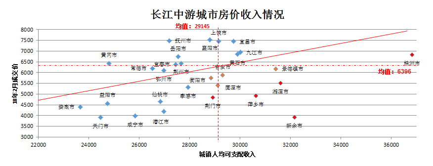 房价收入情况,在均值线下,居民收入较大且距离轴线向下偏离越大代表房价上涨潜力越强。重点关注城市有株洲、新余、湘潭、萍乡、荆门;一般关注城市景德镇、吉安、鹰潭、衡阳。