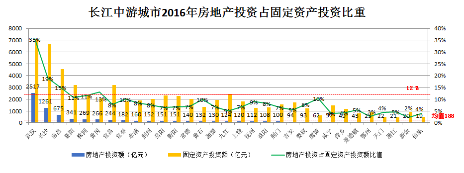 2016年长江中游城市群房地产投资额为7837亿元,占全国房地产投资额135284亿元的5.79%;房地产投资额在均值188亿元以上的城市有7个,分别为武汉、长沙、南昌、襄阳、株洲、黄冈、宜昌。房地产投资占固定资产投资比重超过25%的有1个,即武汉,此区域房地产投资相对过热,建议谨慎拿地;介于15%至25%的有2个,分别为长沙、南昌,此区域为房地产合理投资区,建议重点关注。在15%以下的城市有28个,此区域房地产投资相对较少,存在潜在投资机会。