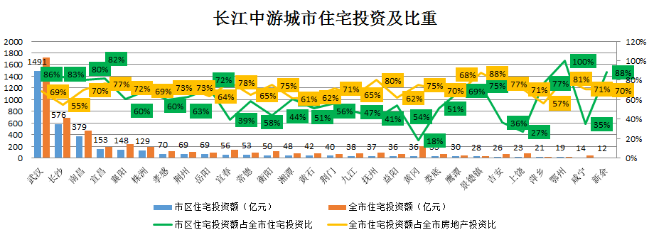2016年长江中游城市群住宅投资额为5250亿元,住宅投资额在均值137亿元以上的城市有8个,分别为武汉、长沙、南昌、宜昌、襄阳、株洲、宜春及黄冈。整个城市群住宅投资额占房地产投资额比重为68%,市区住宅投资占全市住宅投资的71%。市区住宅投资占比低于50%的城市有19个:武汉、长沙、南昌、宜昌、襄阳、株洲、孝感、荆州、岳阳、常德、湘潭、黄石、荆门、益阳、娄底、鹰潭、景德镇、萍乡、鄂州及新余,以上城市所辖县级城市房地产投资较为活跃,应重点关注。