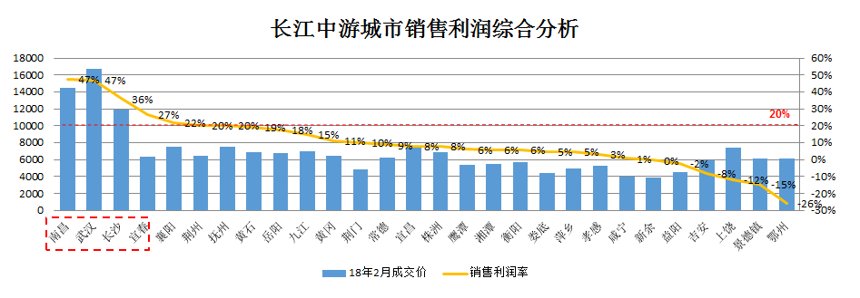 从销售利润率看,大于25%的城市有4个,为南昌、武汉、长沙及宜春;20%-25%的城市有3个,为襄阳、荆州、抚州。销售利润率=(房价-地价-土地外成本-增值税)/房价,土地外成本按3600元估算。增值税=(房价-地价)*10%/(1+10%)-3600*8%。