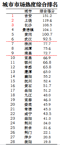 长江中游城市群城市市场热度综合排名TOP3的城市为:吉安、上饶、长沙。