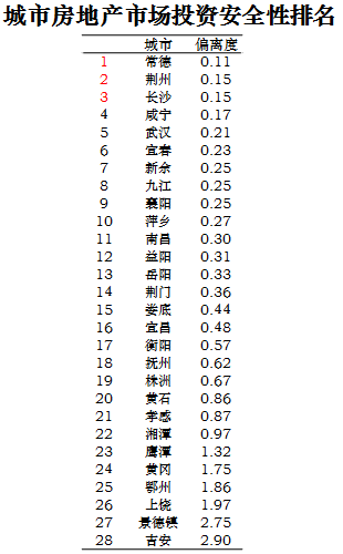 长江中游城市群城市房地产投资安全性综合排名TOP3的城市为:常德、荆州及长沙。偏离度大于1的城市投资风险较高,应谨慎投资,主要城市有吉安、景德镇、上饶、鄂州、黄冈及鹰潭。