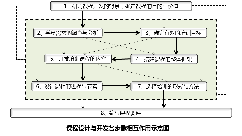 基于前述“培训课程的六线模型”,可以将课程设计与开发的过程分解成以下八个操作步骤: