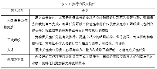 关键任务及依赖关系、氛围及文化、人才、正式组织这四大构件,组成了BLM所定义的组织执行力,四大构件的主要内涵,见表5-1.