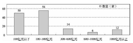 从图1-5可以看出,总资产在1000亿元以上的城市商业银行有12家,总资产在600亿元~1000亿元的城市商业银行有6家,总资产在300亿元~600亿元的城市商业银行有14家,总资产在100亿元以下的城市商业银行有50多家。由此可见,我国城市商业银行的资产规模偏小。