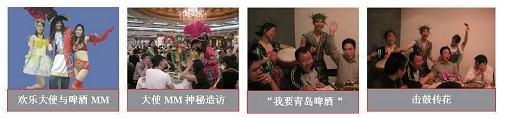 项目组的顾问总监扮演成啤酒大使,形同一个小丑,顽皮淘气、滑稽可爱;项目组的两个文案扮演成漂亮的啤酒 MM,突然造访当地的一个大酒楼,开展了一系列现场趣味活动,其中有击鼓传花,寻找幸运星,“我要青岛啤酒”语言赛(广东话、东北话、英语等),“我要青岛啤酒”高分贝争霸赛、绕口令、“青岛啤酒王中王”竞饮比赛、快乐有奖问答等互动性较强的活动(如图1-2所示)。当晚到访的酒楼全场轰动,这种轰动效应真的出人意料,这个酒店那天晚上啤酒消费翻了四倍。