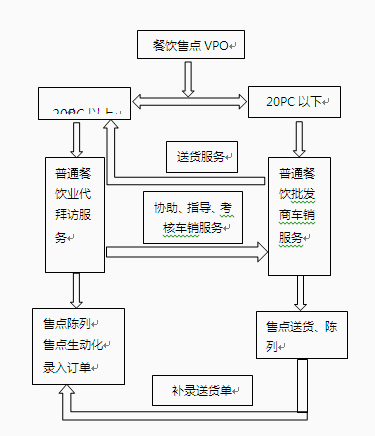 普通餐饮批发商下线客户清单,文员每三个月调整一次,月均VPO超过20PC的餐饮售点升级由普通餐饮业代服务,低于20PC调整到普通餐饮批发商车销服务,以提高普通餐饮售点的服务和运作效率。