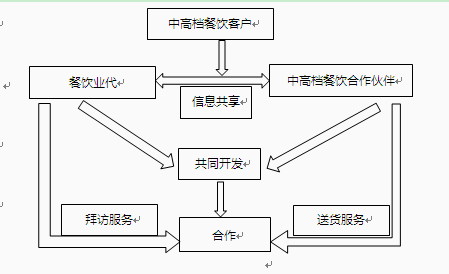 与中高档餐饮合作伙伴合作后,充分利用其下线客户信息资源共同开发、快速拓展客户。新的餐饮客户,餐饮业代将门店信息、关键人信息与中高档餐饮合作伙伴充分共享信息,中高档餐饮合作伙伴利用自身产品品类优势、配送服务优势、客情优势,餐饮业代通过品牌企业品牌优势、资源优势,双管齐下,取得与餐饮客户的合作。如图4-14所示。