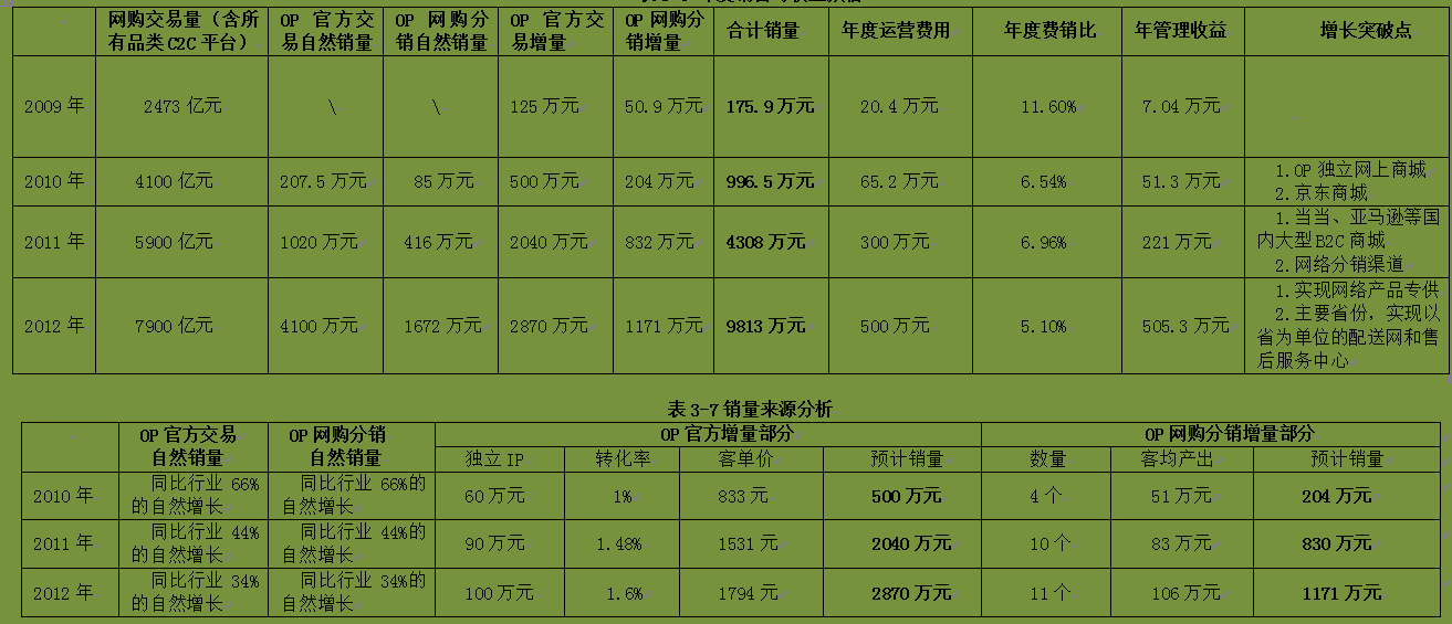 网购的目标消费者与传统渠道的消费者存在一定的差异,这正好在一定程度上弥补在地级市,尤其是一线城市的销售软肋。网购的目标不是和传统渠道抢消费者,尤其不会通过价格竞争的方式抢夺消费者(目前的网购价格,除掉运费、包装、税费、各类扣点等费用后,可以保证渠道客户利润在30%50%,即使是促销,扣掉各类费用后,也可以保证客户的利润在20%左右)。OP网购的目标消费者是:地级市以上有网购经验的人群,现代意义上的宅男宅女,以及由于消费习惯改变、从传统渠道流失的部分客户。