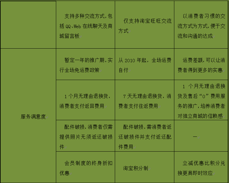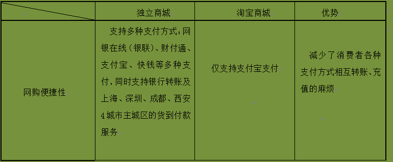 OP独立商城推行相对于淘宝商城在网购便捷性和服务满意度上的优势竞争策略,主要体现如表3-5所示: