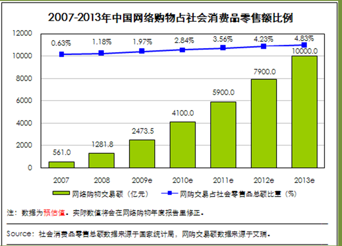 3-5 2007-2013年中国网络购物占社会消费品零售比例