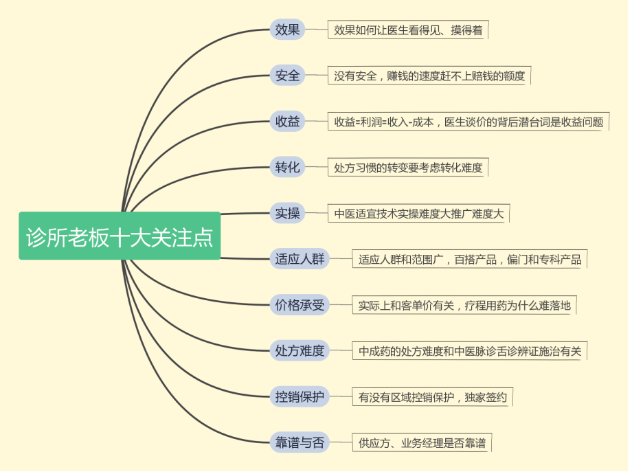 所以,诊所老板在做采购决策、在处方上量、在评估你的产品到底价值多少的时候,他考虑关注的点都在这十条因素里。