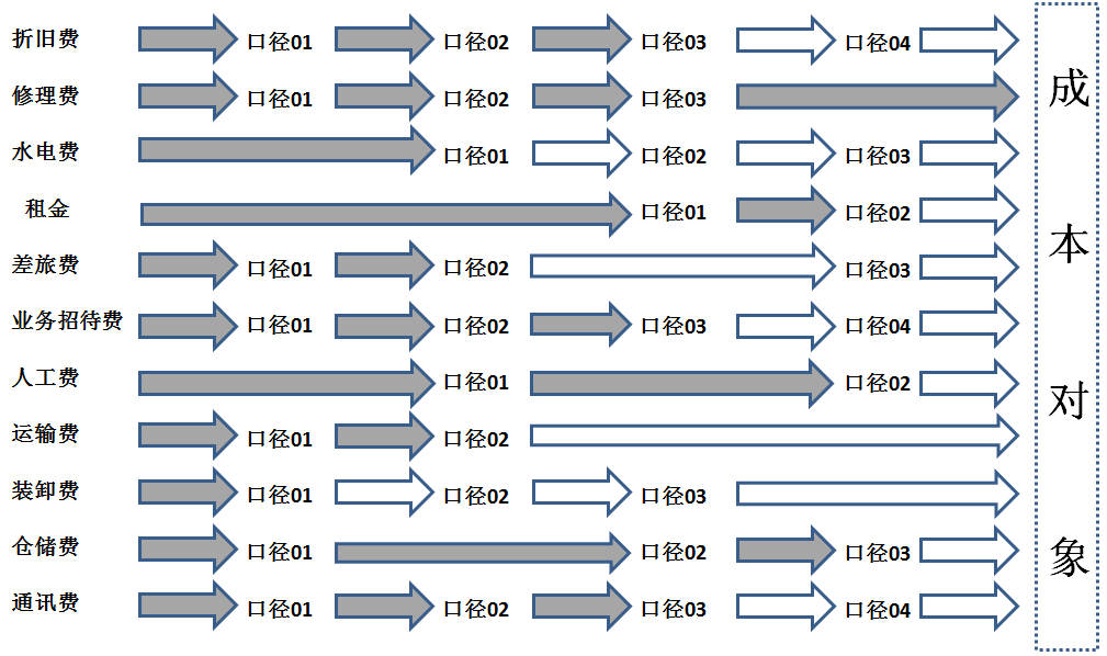 对于某个费用项目,传统成本计算往往采用一个分摊标准向产品进行分摊。多维组合成本计算,由于费用项目下的不同明细可能有不同的分摊标准,因此需要按每个明细项目进行分摊,工作量会比较大,当然也仅仅是工作量的问题。许多明细项目的归集和分摊方式是完全相同的,因此可在穷举式调研的基础上按归集和分摊方式对明细项目进行分类,同一分类的明细项目可统一进行归集和分摊。