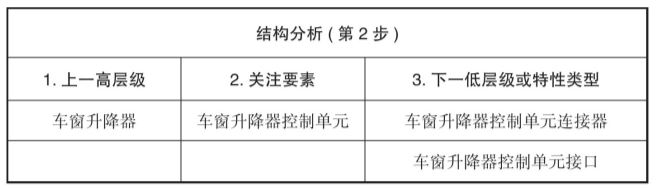 结构分析要分析到关注焦点的上下级,比如电子控制单元是FMEA-MSR的关注焦点,它的上级是车窗升降系统,这个系统还包括其他的硬件,它的下级是连接器/感应器/执行器/电子控制单元。如图5-4所示。