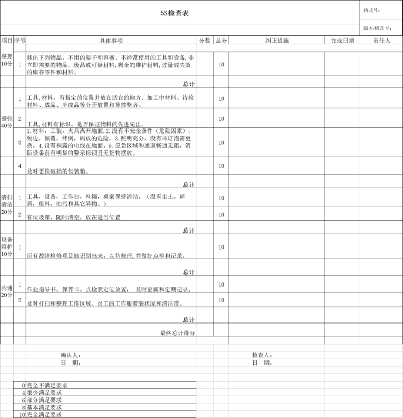 仓库、办公室、车间,根据5S的要求,对各个区域建立检查清单。由于每个区域的情况不同,我们分别建立了仓库、办公室和车间的5S检查清单。