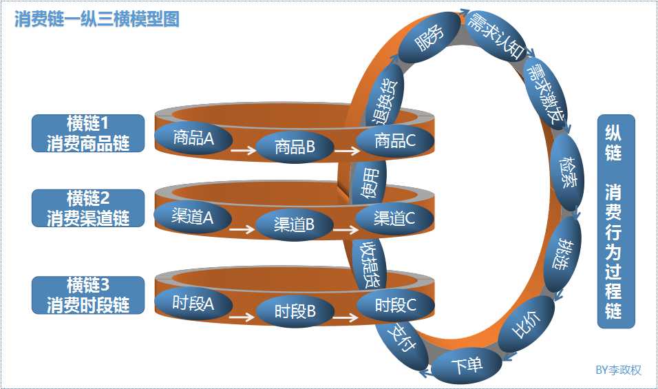 这个链条,主要就由一条纵链(即消费行为过程链)与三条横链(即消费商品链、消费渠道链、消费时段链)组成。