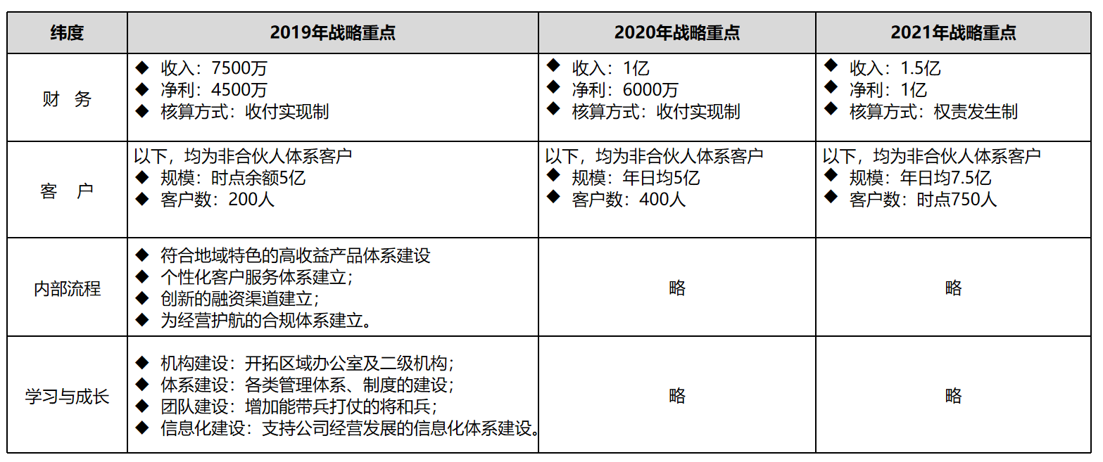 TO投资管理处于高速发展期,公司层级更多的是关注一些经济指标(净利润、营业收入、新增募资额),一些核心的业务要求变成了需要去做公司级的经济指标拆解,需要去做职能和流程的梳理,在重点关注经济指标的同时,对客户价值、内部运营、学习与成长也根据公司现状提取相应的指标。HC咨询团队认为,在确定指标的过程中,既要保证实现公司当年经济效益,又要引导公司走向健康与成长。