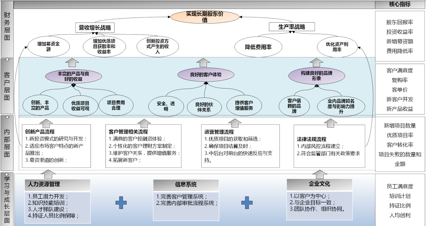 TO 投资战略目标按照从上到下依次是财务、客户、内部运营、学习与成长四个维度的逻辑关系进行层层分解。财务层面主要是阐明了公司所经营行为所产生的可衡量性经济结果,体现了公司对股东价值的增值。客户层面的重点是公司期望获得的客户和细分市场,部门如何满足内部和外部客户的需求。内部运营层面的重点是为了吸引并留住目标市场的客户,并满足股东的财务回报率期望,公司必须擅长什么核心经营流程,并符合公司的价值观趋向。学习与成长层面的重点是为了取得竞争成功,组织以及员工需要具备的核心知识和创新精神。