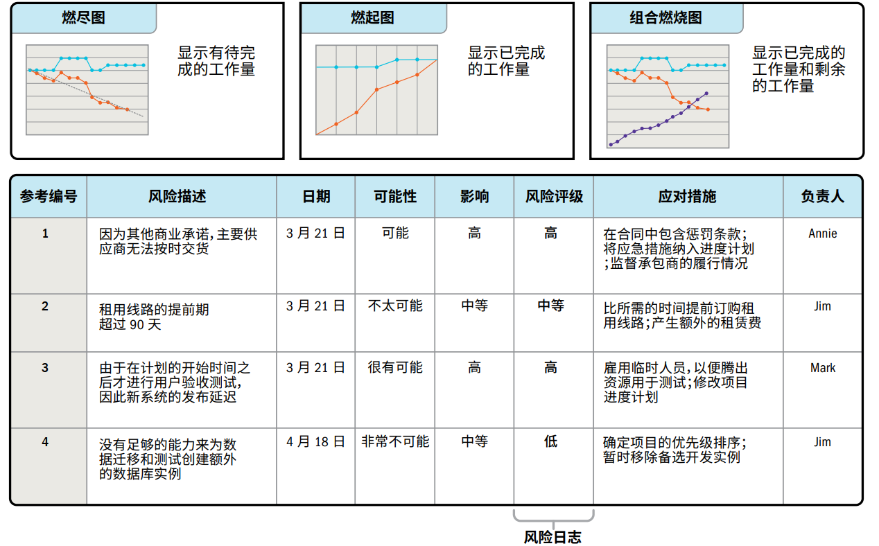组合燃烧图就是将燃尽图和燃起图组合起来,同时显示已完成的和剩余的工作量。