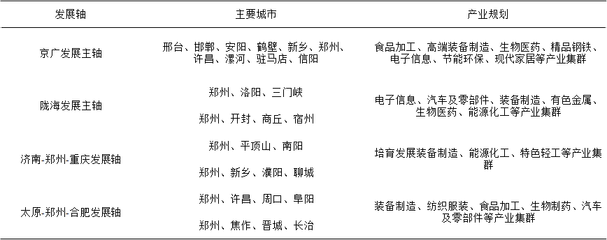 伴随着以高铁为骨架的交通网络的不断完善,根据《中原城市群发展规划》,依托 “米字型”交通网络结构,打造特色鲜明、布局合理的现代产业发展带;其中,沿京广发展主轴及陇海发展主轴已经形成,其余两个发展带将随着高铁的建成逐步形成。