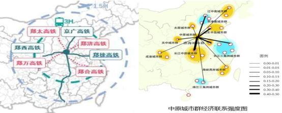 第三、米字型高铁架构加强了中原城市群与其他城市群的经济联系强度。从高铁规划图和经济强度联系图对比分析可以看出,当前郑州已经开通京广、郑西和郑徐高铁,相对应的,中原城市群与京津冀、长江中游、淮海城市群的经济联系强度也更紧密。未来,郑万、郑合、郑太和郑济4条高铁线路也将陆续建设开通,“米字型”高铁网络的建成将使郑州到合肥、济南、太原、徐州等城市的时间缩短至2小时以内。我们将会看到中原城市群与成渝、关中、山东半岛城市群的联系也将日益紧密起来。