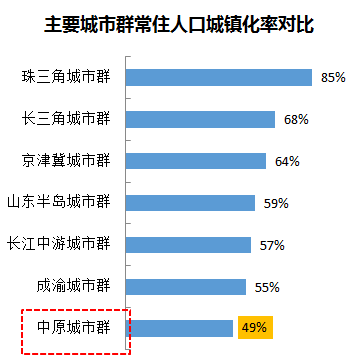目前,中原城市群常住人口城镇化率为49%,不仅远低于我国常住人口城镇化率57.4%,也处于我国主要城市群常住人口城镇化水平的末位,仅河南省农村人口就近5000万人,因此,提升中原城市群城镇化水平,是建设中原城市群的一个重要任务。根据规划,中原城市群到2020年城镇化率将达到56%,预计有1000万人实现城镇化。如能达到京津冀城市群64%城镇化率水平,预计有2400万人实现城镇化。