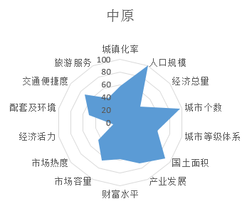 从城市群投资潜力雷达图可以看出,中原城市群是国内较具发展潜力的城市群,人口规模、产业发展、交通便捷度均得分较高。经济总量、经济活力、旅游服务、城镇化率均得分较低。